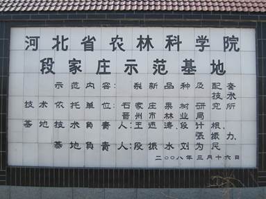 作为河北省农林科学院重点示范基地,院连续多年设立科技服务项目予以经费支持,石家庄果树研究所与晋州市林业局紧密合作,开展示范基地建设和科技服务工作。在河北省农林科学院的领导和支持下,通过所、县、局、村及广大果农的努力,示范基地生产的梨果内外品质俱佳,且石细胞少、果味浓郁、酸甜适口,深受消费者欢迎 ,除畅销广州、深圳、上海等国内大中城市及港澳外,还远销欧美、东南亚等国家和地区。由于该基地成效显著,段家庄村被评为“河北省果树增收示范村”,示范园通过了河北省梨无公害基地认证和出口果园注册,并入选农业部挂牌的标准园。