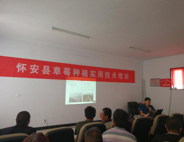 2018~2019年草莓研究室成员多次赴河北省石家庄鹿泉、正定、藁城、栾城、平山、新集,张家口怀安,保定安新、涞水、满城、博野等地草莓产区进行技术服务,讲解草莓品种选择、育苗技术、病虫害防治、温室栽培等技术,以室内讲座、田间指导以及电台讲解等多种形式为农民培训,为莓农增收及河北省的草莓产业发展做出了积极的贡献。