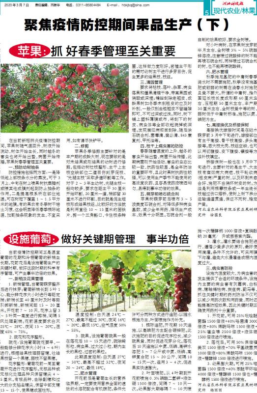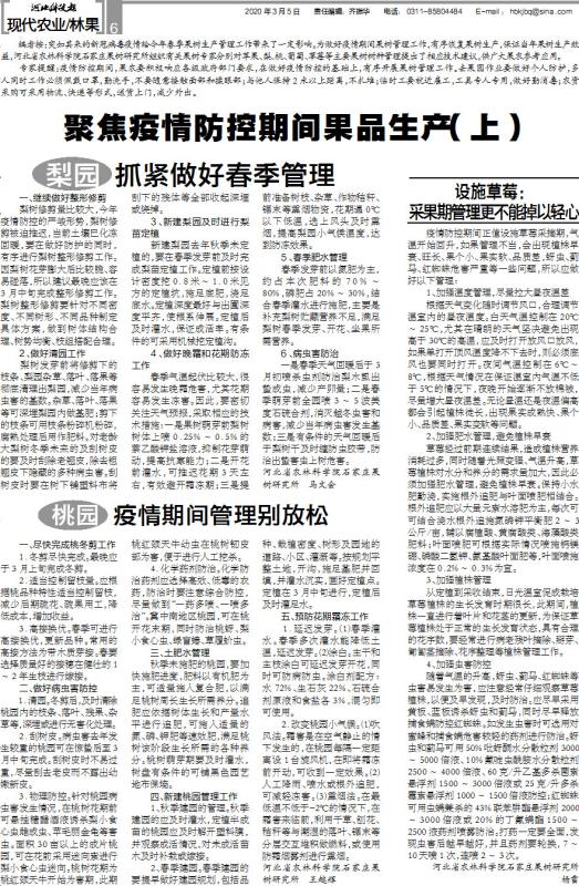 您所在的位置:首页 > 综合动态 为做好疫情期间果树管理工作,有序恢复果树生产,保证当年果树生产效益,在做好疫情防护的基础上,河北省农林科学院石家庄果树研究所组织有关果树专家分别对苹果、梨、桃、葡萄、草莓等主要果树树种当前疫情期间管理提出了相应技术建议,在《河北科技报》以“聚集疫情防控期间果品生产”,分上下两期分别于3月5日和3月7日刊登,指导广大果农疫情期间果树生产管理。