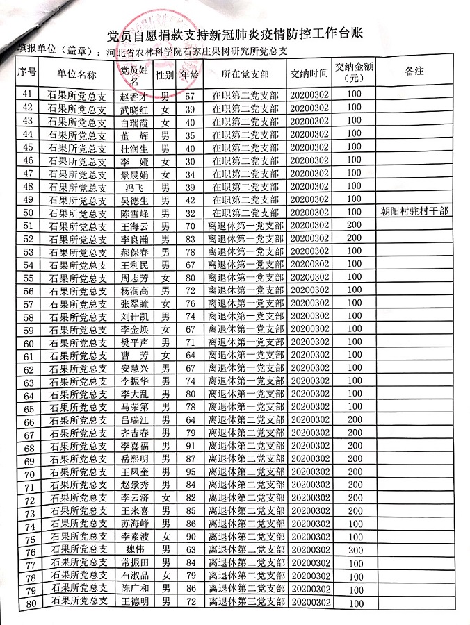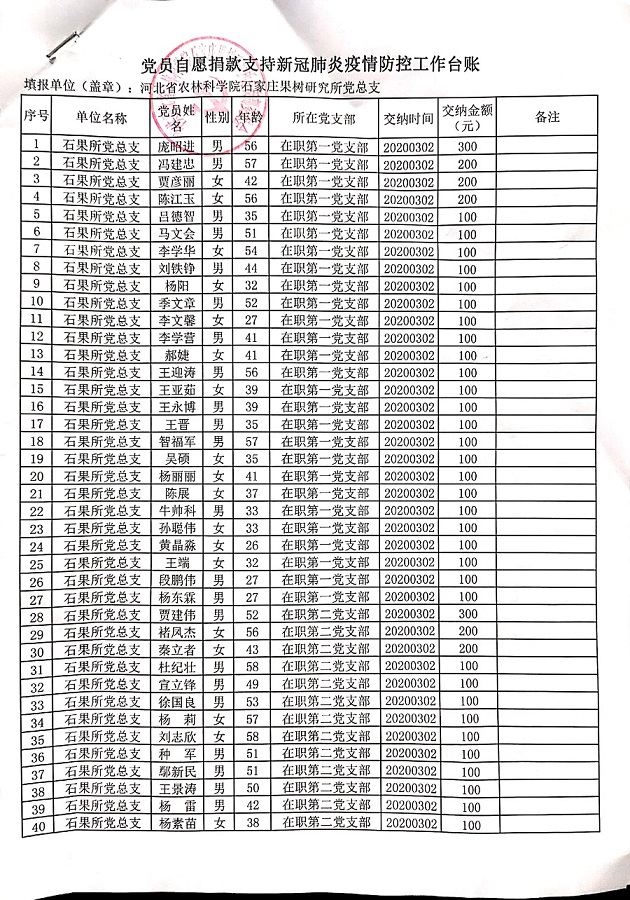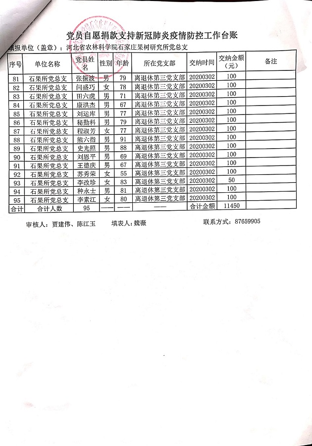 您所在的位置:首页 > 工作动态 为支持全国疫情防控工作,响应上级党组织号召,根据院直属机关党委《关于组织党员自愿捐款支持新冠肺炎疫情防控工作的通知》精神,石果所党总支积极组织开展党员自愿捐款活动,截至2020年3月3日,我所共有包括在职支部、离退休支部在内的95名党员捐款,合计金额11450元。