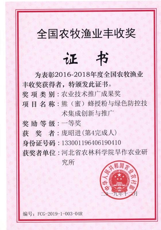 “熊(蜜)蜂授粉与绿色防控技术集成、创新与推广”根据农业农村部“蜜蜂授粉与病虫害绿色防控技术集成示范”项目下达的试验示范任务,在河北省建立番茄熊蜂授粉和樱桃蜜蜂授粉与绿色防控技术集成示范基地,集成技术模式和推广模式,并进行大面积示范推广。2014年-2018年建立省级以上示范基地156个,市县级示范基地218个;在投入品熊蜂和天敌昆虫生产环节实现了创新;集成了设施番茄熊蜂授粉、露地樱桃蜜蜂授粉与病虫绿色防控技术模式2套;形成了“订单生产+推广协调+技术服务”一体化的合作推广模式,构建起“政府主导+科研企业协同攻关+植保技术指导+农民合作组织实施”的推广机制;举办全省规模的大型培训会和观摩会8次、地方培训370次,累计培训47300余人次;在央视等重要媒体多次宣传报导;推广应用面积达170.40万亩,辐射带动400万亩次,总经济效益达到377346.72万元,经济、社会、生态效益显著。同时,熊蜂和天敌产品还扩展到京、津、陕、甘、内蒙、新疆等20多个省市区。通过该项目技术的示范与推广,为提升河北省蔬菜、果品产业的科技含量、产品安全水平、质量效益水平、产业综合素质和可持续发展能力,提供了有效模式和途径。