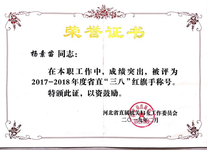 您所在的位置:首页 > 荣誉专栏 我所苹果栽培研究室副主任杨素苗同志,在本职工作中,成绩突出,于2019年2月被河北省直属机关妇女工作委员会授予“2017-2018年度省直‘三八’红旗手”荣誉称号。