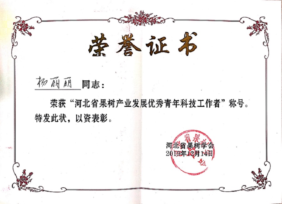 杨丽丽同志荣获“河北果树产业发展优秀青年科技工作者”称号