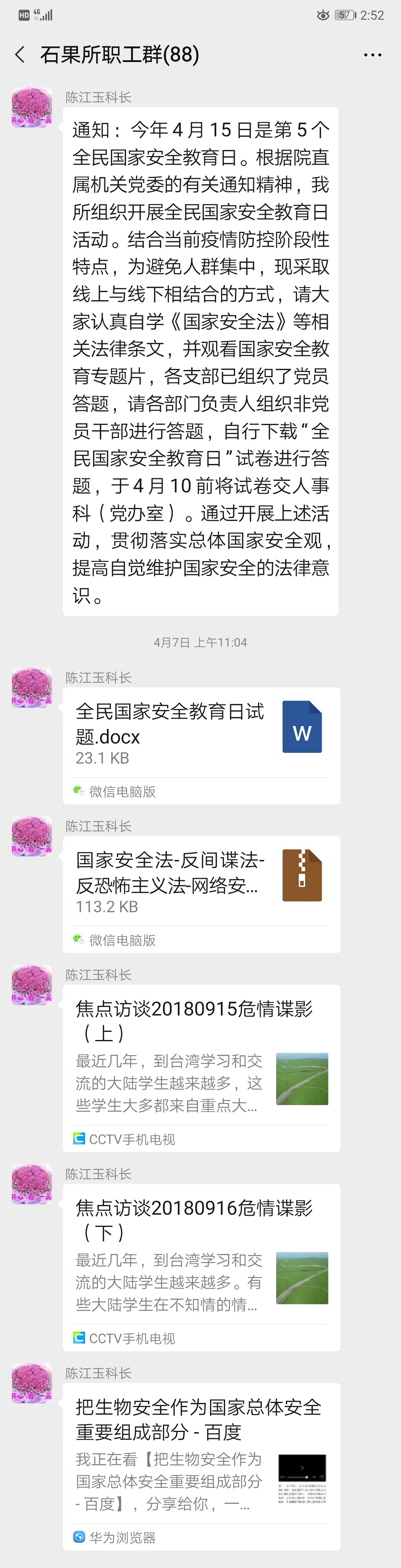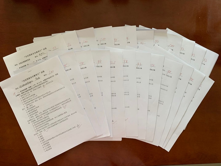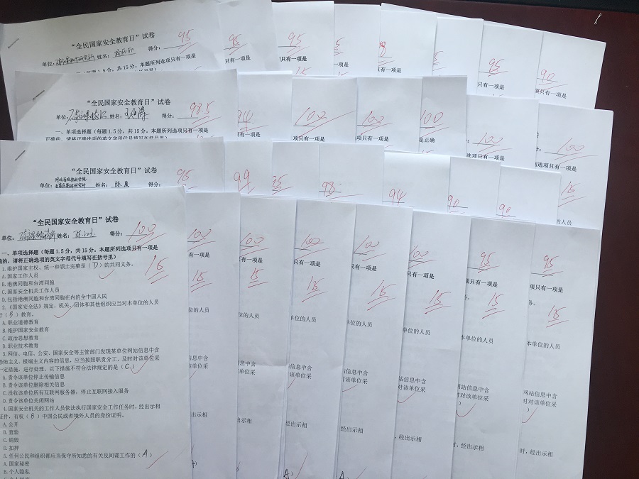 鉴于当前疫情防控阶段性特点,各支部采取了线上与线下相结合的方式,组织开展了国家安全专题法律学习活动,在微信群、QQ群发送了《国家安全法》《反间谍法》《反恐怖主义法》《网络安全法》《保守国家秘密法》等相关法律条文以及《危情谍影》《把生物安全作为国家总体安全重要组成部分》两部宣传教育片,供大家自学和观看。利用LED屏滚动播出《国家安全法》《反间谍法》等相关国家安全教育宣传标语,增强宣传力度。以支部为单位组织,结合主题党日,开展了国家安全知识答题活动,广大党员严肃对待,认真作答,统一组织答题并上交了试卷。
