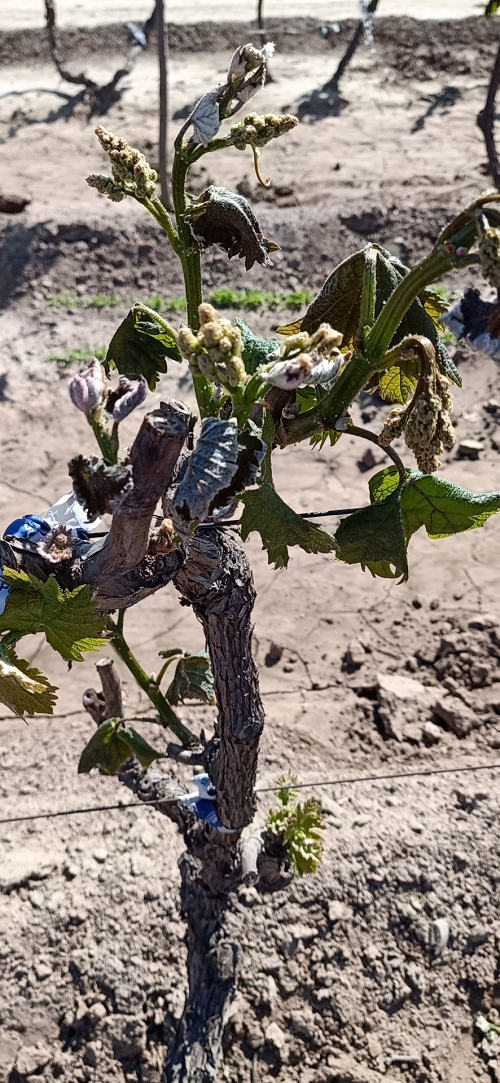 (2)中度霜冻:新梢上部50%左右的嫩梢及叶片受冻,花序基本完好,可在霜冻结束后,将新梢受冻死亡的部分剪除,促使剪口下叶芽尽快萌发,恢复正常生长。