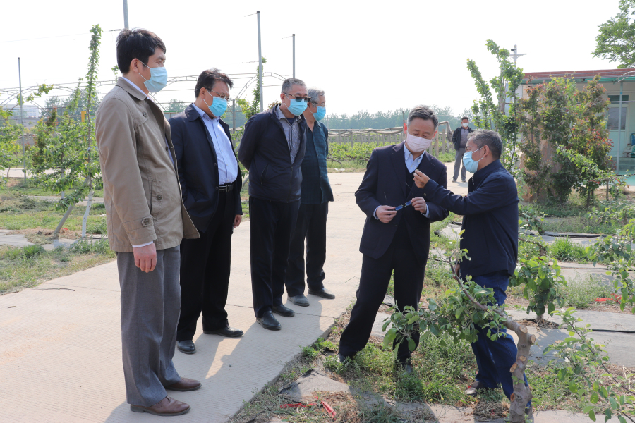 随后,孙世刚副院长一行来到石果所试验园区调研。石果所党总支书记、所长庞昭进向孙世刚副院长介绍了所内葡萄园区的冻害情况,副所长冯建忠介绍了苹果园区的冻害情况。孙世刚副院长还查看了试验园区的苹果示范园和灌溉系统的建设情况。
