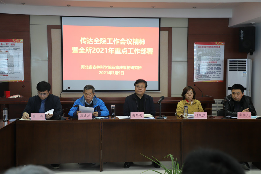 会上,班子成员传达了全院工作会议精神,并就分管工作提出了明确要求。庞昭进所长作最后发言,他深刻剖析了我所当前发展面临的形势和存在的问题,提出了发展目标,明确了六大工作思路和八项重点工作。庞所长强调,本次会议旨在使全体干部职工统一思想、凝聚共识、明确工作重点,补短板、强弱项,形成工作合力,以优异成绩迎接建党一百周年。全体干部职工要按照全院总体部署,围绕农业高质量发展要求,开拓创新,勇于担当,攻坚克难,为把我所建成省内一流、国内有影响的专业研究所做出更大的贡献。