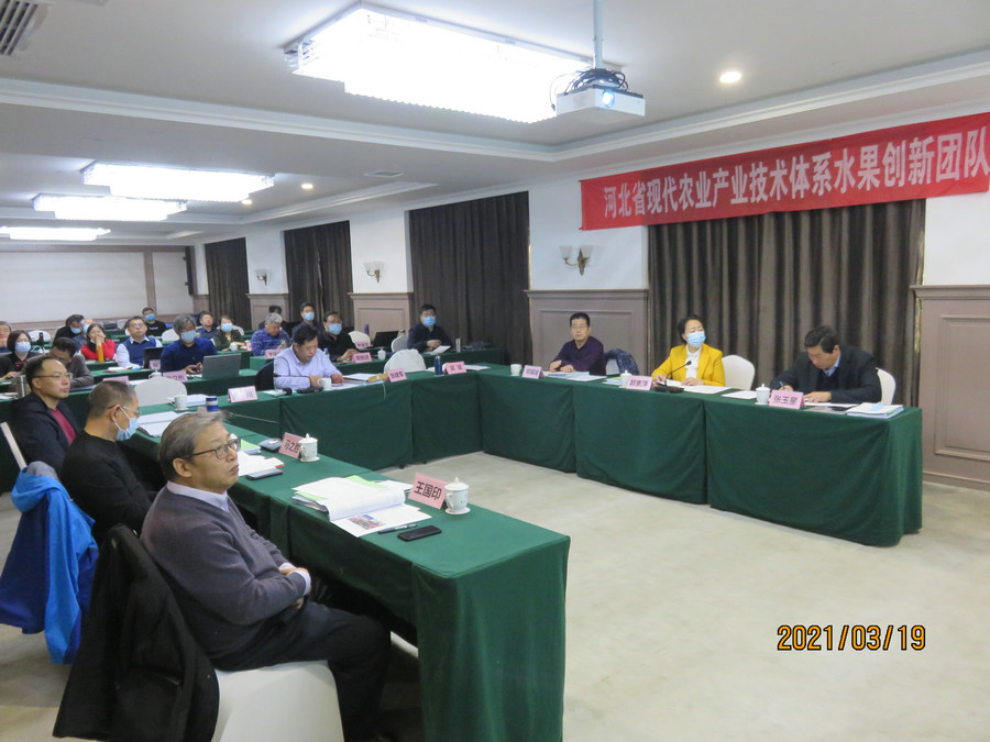 您所在的位置:首页 > 综合动态 2021年3月18-19日,河北省现代农业产业技术体系水果创新团队2020年度考评暨2021年工作部署会在石家庄正定召开。河北省农业农村厅特色产业处王旗处长、科教处郑福禄副处长,河北省财政厅教科文处吴堃副处长,水果团队首席办依托单位河北省农林科学院石家庄果树研究所庞昭进所长、董辉副所长出席了会议。河北省农林科学院成果转化处王国印处长,河北农业大学全国人大代表郭素萍研究员、国家梨产业技术体系岗位专家张玉星教授,国家桃产业技术体系石家庄站马之胜研究员,泊头亚丰果品有限公司于立祥副总经理等作为考评组专家对各岗站2020年度工作进行考评。会议由水果创新团队首席专家、河北省农林科学院副院长张建军主持。