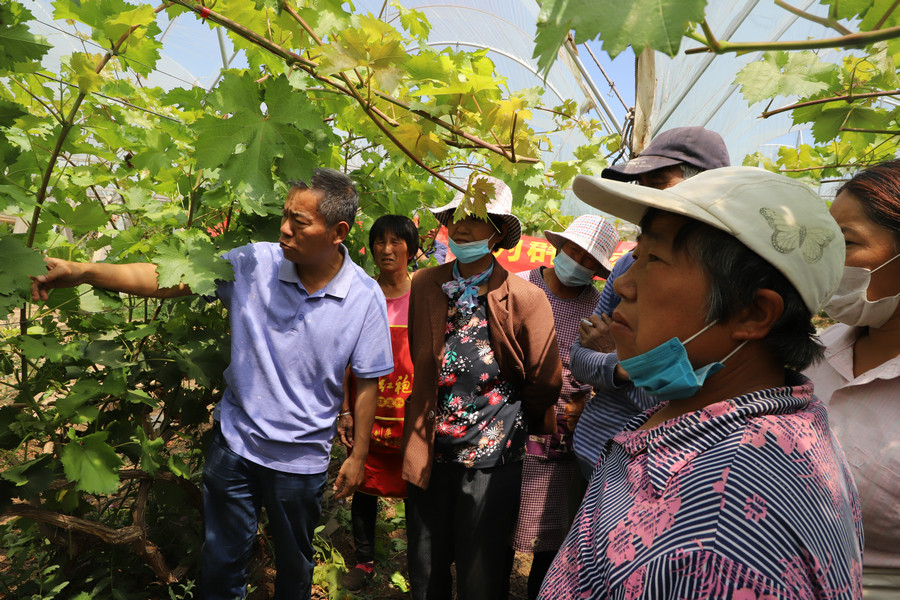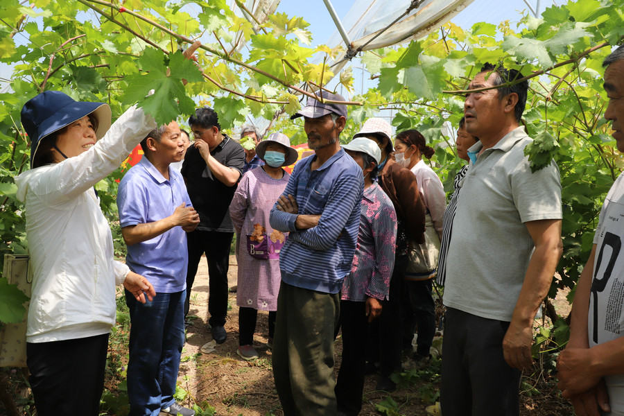 葡萄专家褚凤杰首先利用多媒体技术手段为梅庄村村民讲解了当地选种的阳光玫瑰与克瑞森葡萄品种的种植、生产相关知识。随后,来到葡萄种植大棚,查看了两个品种的长势,针对目前坐果少、果实生长不均匀等问题开出药方并现场进行修剪示范。冯建忠研究员对改善目前果实生长情况给出了中肯的建议,一定要依照现有基础,有侧重地进行管理,争取效益最大化。
