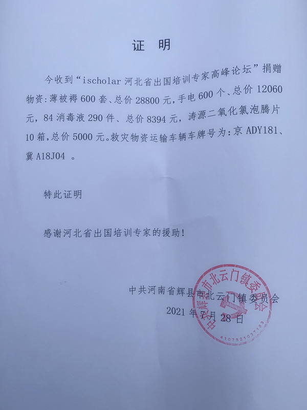7月28日,我所副所长、共产党员董辉作为河北省出国培训专家代表团志愿者,主动承担运送救灾物资任务,将救灾物资运送至河南辉县北云门镇。此次捐赠的应急救灾物资包含薄棉被褥、应急照明手电、消毒片(消毒环境用)和84消毒液等。
