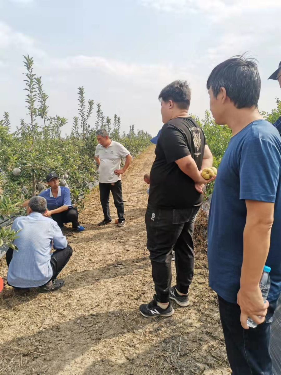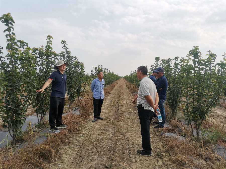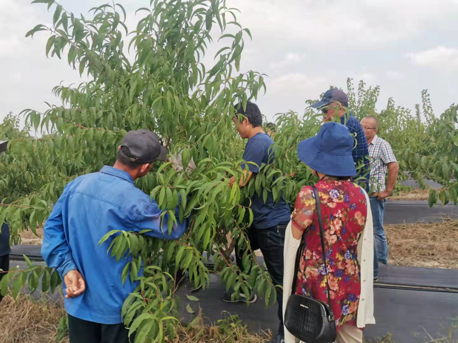 褚凤杰研究员一行在逐一查看了桃、樱桃、杏、苹果、梨等果园及种苗圃生长状况后,针对现阶段存在的问题,王越辉副研究员对桃的管理技术进行了现场指导;王永博博士就密植梨架式构建及相应整形技术进行了指导;徐国良研究员就樱桃和苹果下一步关于水肥、病虫防控等管理工作提出可行性建议;基地负责人采纳了褚凤杰研究员、王景涛副研究员就种苗圃嫁接品种、嫁接时间提出的意见建议。