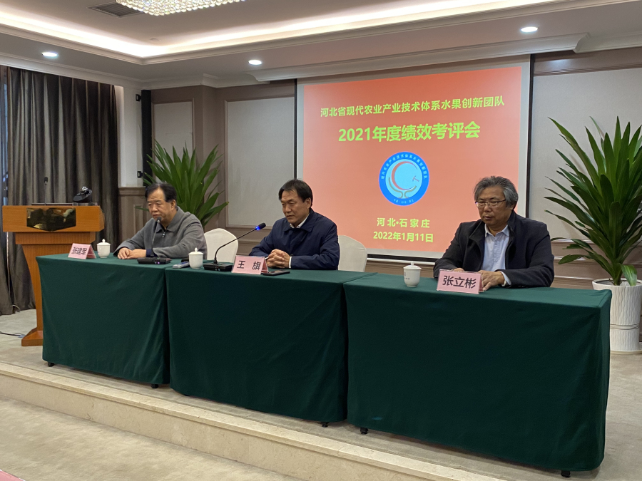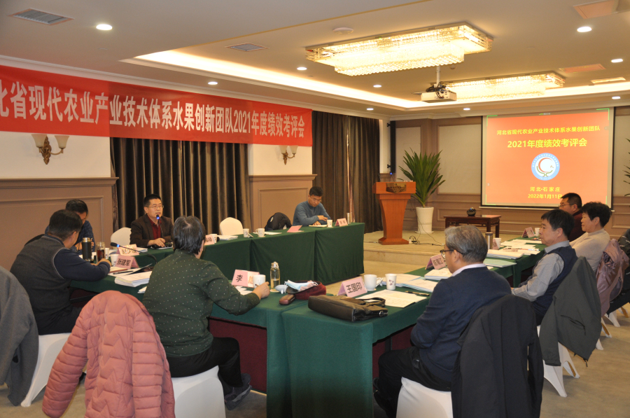 您所在的位置:首页 > 综合动态 2022年1月11日,河北省现代农业产业技术体系水果创新团队2021年度绩效考评会在石家庄召开。会议邀请了河北省农业农村厅、河北科技大学、河北省农林科学院、河北农业大学、河北省特色产业协会、石家庄泽桑葡萄园区等单位专家组成考评小组,对水果创新团队岗位专家和试验站长2021年工作进行绩效考核。河北省农业农村厅二级巡视员王旗、科教处副处长郑福禄、特色产业处副处长赵少波、河北省农林科学院石家庄果树研究所庞昭进所长等领导莅临指导。创新团队首席专家、河北省农林科学院副院长张建军,各岗位专家、试验站站长和团队成员等共40余人参加了会议。庞昭进所长致欢迎词。
