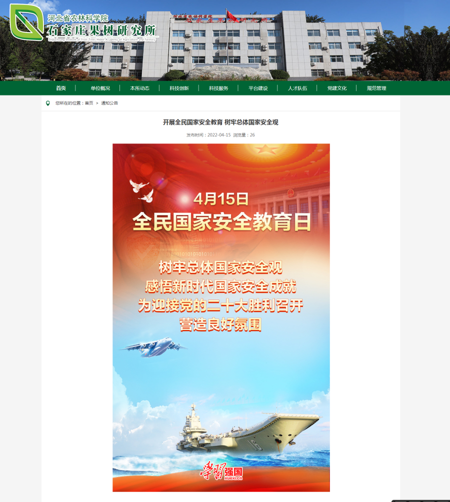 根据院机关党委通知精神,所党总支进行了活动安排部署。各支部党员积极参与“河北机关党建”开展的国家安全知识竞答活动,通过答题了解了国家安全、科技安全的重要意义等国家安全知识;办公楼LED屏幕播放国家安全教育基本常识,研究所网站转载“学习强国”国家安全教育日主题海报,多渠道进行国家安全教育宣传,切实提升全体干部职工的国家安全意识,动员大家共同努力,汇聚起维护国家安全的力量,为迎接党的二十大胜利召开营造良好氛围。