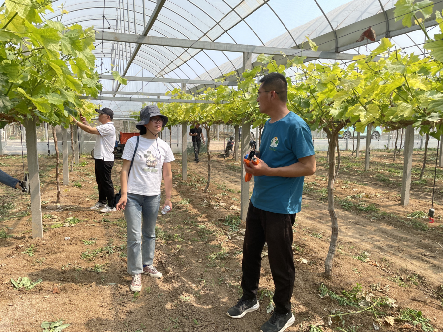 团队成员首先在泽桑基地布置了今年的果实品质提升试验,调查了区试优系的生长结果情况,同时对园区阳光玫瑰葡萄叶片黄化问题问诊把脉,提出合理负载、适时施有机肥,保证枝条营养贮存等技术建议。随后前往绿康果业基地查看今年新建避雨棚的情况,了解新模式对周围果农的带动作用。