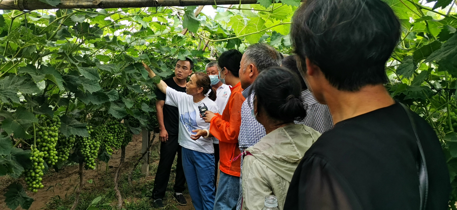 葡萄专家褚凤杰研究员现场查看了葡萄管理情况,针对葡萄留果量偏多、果粒大小不一、穗形不够美观等问题,重点讲解了葡萄的果穗整形技术,示范了疏果方法,明确了留果量。同时对膨果处理、肥水管理,枝条副梢修剪及病虫害防控等管理技术进行了指导。