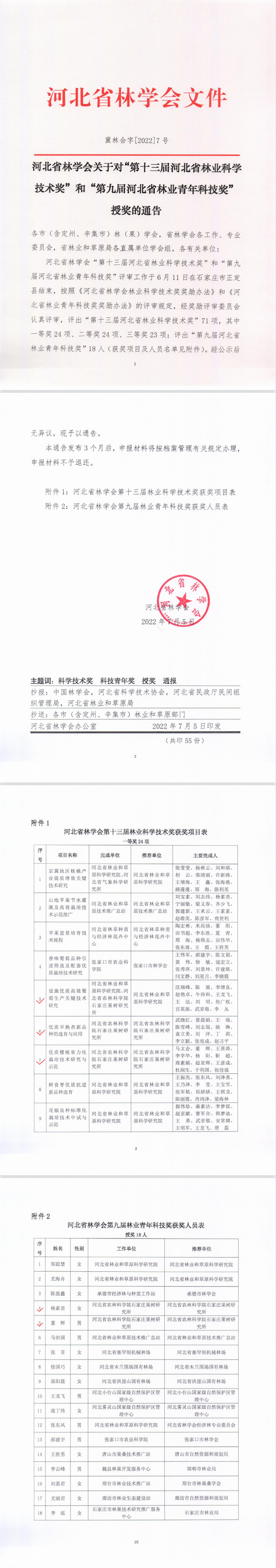 您所在的位置:首页 > 综合动态 根据河北省林学会关于对“第十三届河北省林业科学技术奖“和“第九届河北省林业青年科技奖”授奖的通告获悉,我所喜获两个奖项双丰收。