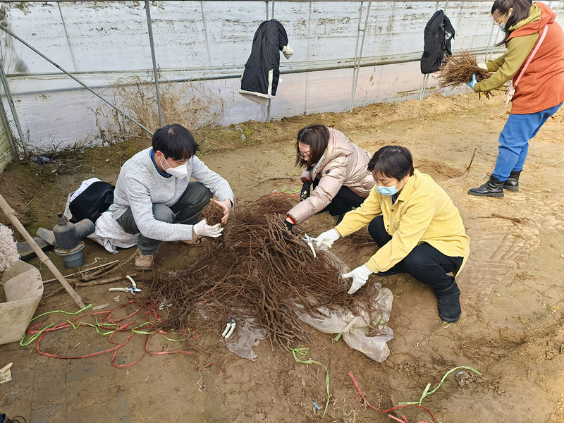 您所在的位置:首页 > 科技服务 2023年2月13日,葡萄研究室杨丽丽主任带队到衡水饶阳县开展葡萄优系的区试试验。首先在衡健基地冷棚内栽植砧木80余株,用于后期优系嫁接,同时对园区的阳光玫瑰葡萄萌芽期注意事项进行指导;随后到东崔村察看2022年在温室中嫁接的优系,经检查,嫁接枝条长势良好,部分新梢已抽出花序,今年会有部分结果。