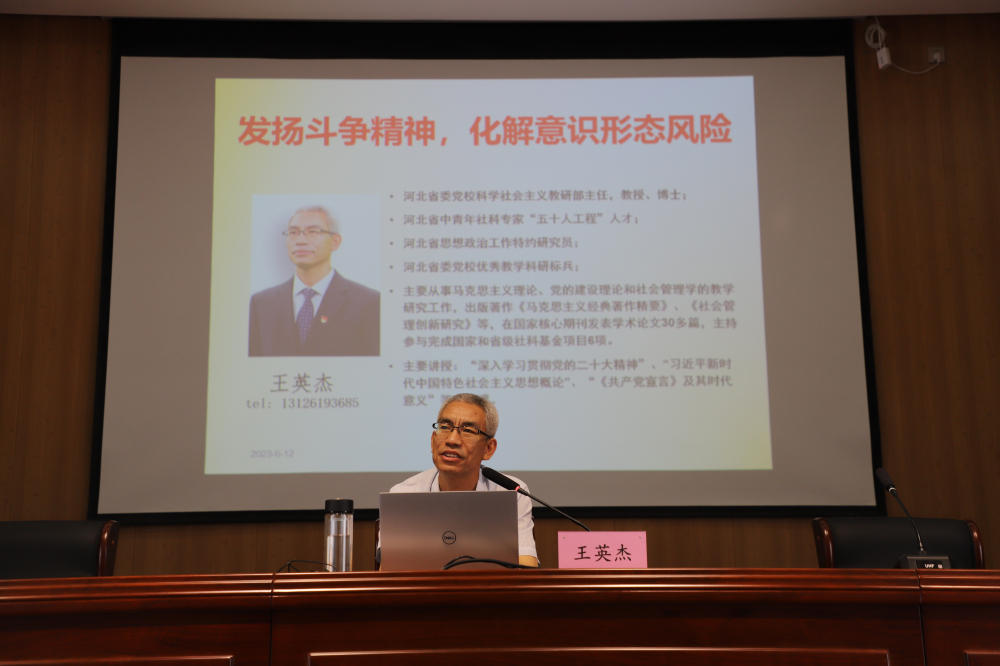 您所在的位置:首页 > 综合动态 为深入学习贯彻习近平新时代中国特色社会主义思想和党的二十大精神,根据党总支学习安排计划,2023年6月12日,党总支邀请省委党校科社教研部主任王英杰教授作专题报告。王英杰教授以“发扬斗争精神,化解意识形态风险”为题,围绕意识形态的重要性、当前意识形态领域面临的重大风险挑战、建设具有强大凝聚力和引领力的社会主义意识形态等三方面进行了深入系统的讲解,授课语言通俗易懂,内容丰富深邃。