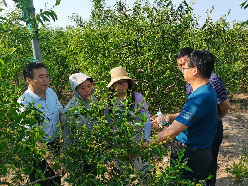 目前,基地冬枣正处在开花坐果的关键时期,两位专家详细询问了基地采取的花期管理技术措施,针对性的提出了一些保花保果的意见和建议。通过实地的参观考察以及基地人员的介绍,两位专家对基地冬枣的树形管理、园区建设提升提出了宝贵意见。