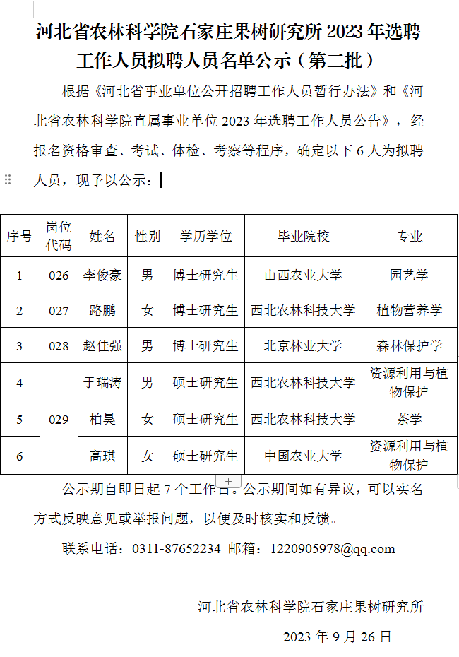 河北省农林科学院石家庄果树研究所2023年选聘工作人员拟聘人员名单公示(第二批)