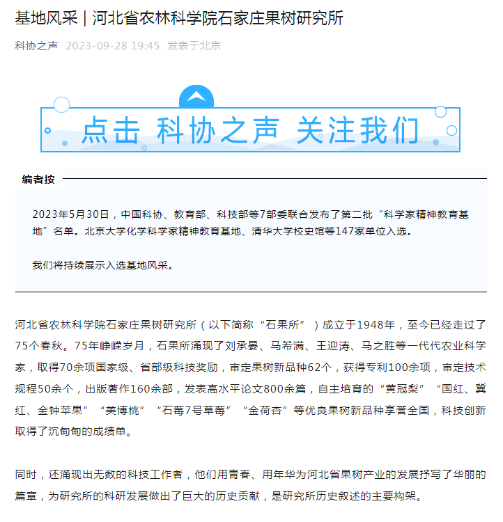 一直以来,我所高度重视弘扬、传承、践行科学家精神,中国科协的宣传报道既是对我所科学家精神教育基地的认可也是对基地今后工作的鞭策。石家庄果树研究所珍惜来之不易的成绩,继续做好本职工作,发挥基地作用,将科学家精神发扬光大。