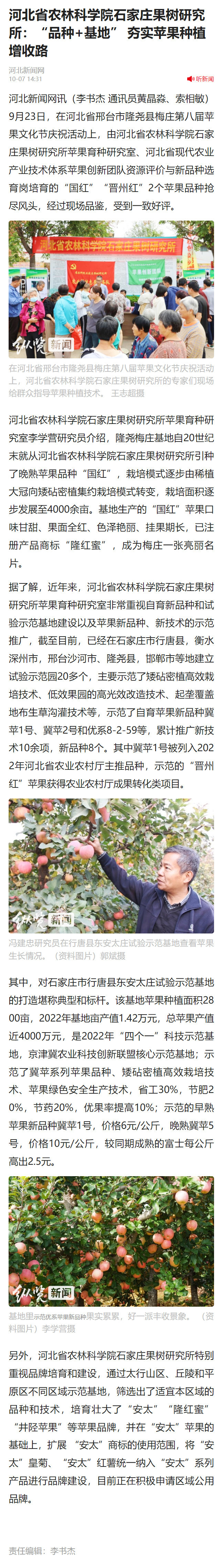 您所在的位置:首页 > 综合动态 2023年10月7日,河北新闻网(纵览新闻)对我所苹果育种研究团队在邢台隆尧梅庄苹果基地与行唐东安太苹果基地开展的科技服务等进行报道。