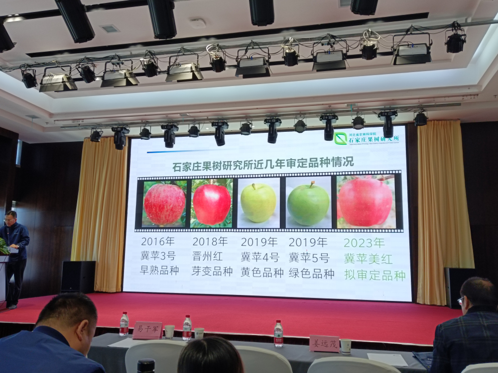 李学营研究员以“石家庄果树研究所苹果育种进展介绍”为题在会上做了报告,对团队近年来的育种目标、育种方法、亲本选择及选育的新品种做了详细介绍。近年来,团队以优质、中晚熟、果面光洁、易着色或黄绿色、栽培省力型为育种目标,采用多组合小群体和半同胞大群体相结合的育种策略,以自育品种(系)‘冀苹5号’、‘冀苹4号’和‘15-1-38’为核心母本配置了19个组合,3个实生后代。现有杂交苗1.7万余株,其中9000余株进入结果期,复选优系46个。团队选育的晚熟绿色品种‘冀苹5号’和晚熟红色优系‘15-1-38’分别在河北、河南、山东、陕西、四川和江苏等地进行了区试。