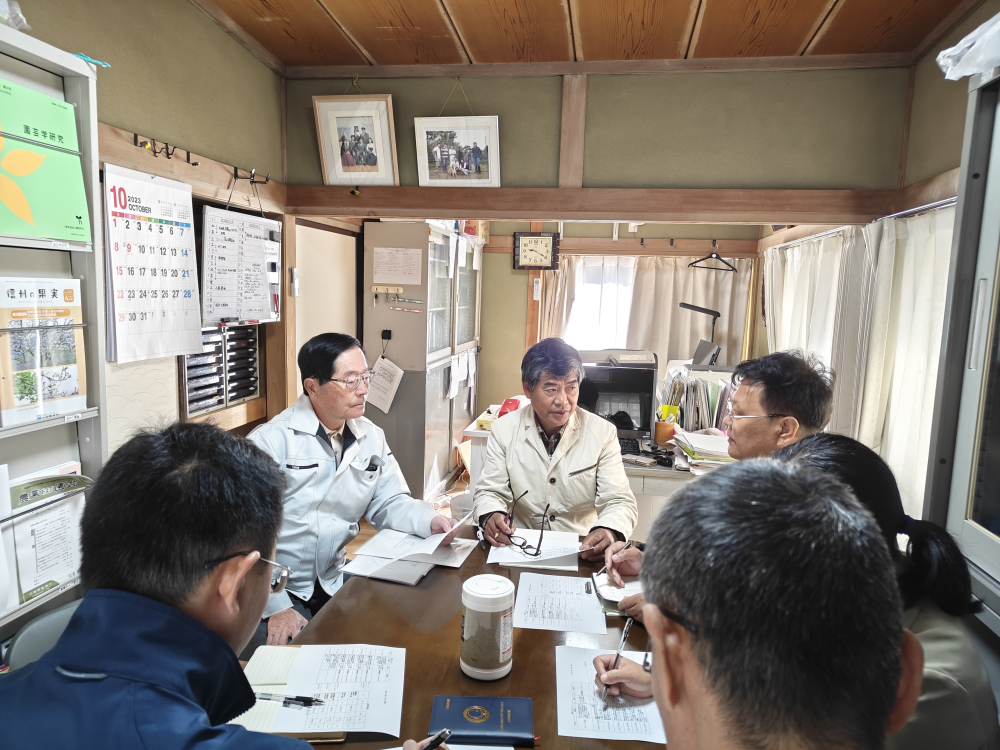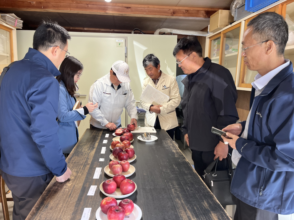 团队针对红肉苹果在日本的品质表现及市场流通情况、红肉苹果在国内的发展前景、日本梨常用矮化砧木及效果等问题,在伴野教授及团队的带领下,考察了信州苹果研究所、南信农业试验场、苹果酿酒厂、选果场,及信州地区苹果密植园及松川町梨园等。在信州苹果研究所品鉴IHR17等7个超级红肉苹果优系果实品质,观察其研究圃内种植的苹果、梨品种生长特征及果实品质,交流栽培管理经验。在苹果密植栽培园及松川町梨园,交流密植园树形、产量及老果园耕作模式、更新过程等问题。与南信农业试验场梨栽培研究员交流南信试验场主栽梨品种及砧木,讨论根腐病试验处理及效果、连干V字架式树形优缺点等。在苹果酿酒厂交流酿酒所用品种、流程及投入产出比等。并前往农产品直销点,调研当地农产品流通价格及收益情况。