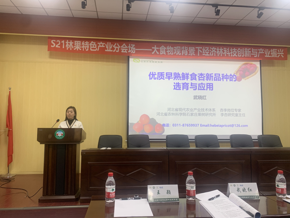 本次大会共设28个分会场,受专题21“林果特色产业”分会场主席乌云塔娜研究员邀请,李杏研究室主任武晓红副研究员携团队成员参加了此次大会。本分会场以“大食物观背景下经济林科技创新与产业振兴”为主题,汇集了林果相关领域的专家、学者的31个学术报告。会上武晓红主任做了题为“优质早熟鲜食杏新品种的选育与应用”专题学术报告,介绍了河北省杏产业发展现状与问题,就团队在种质资源系统评价、早熟杏育种技术创新、新品种选育、提质增效配套栽培技术集成与产业振兴等方面进行了汇报。