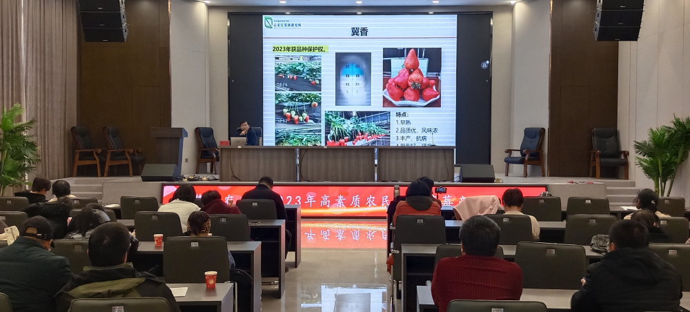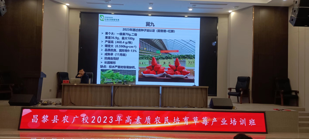 杨雷研究员以《优良草莓品种及生产中常见问题》为题进行了技术培训,内容主要包括草莓的营养保健价值、河北省草莓生产现状、优良草莓新品种及生产中常见的主要问题等方面进行了讲解,重点讲解了自育草莓新品种‘冀九’的果实特性、早熟性、丰产性、耐贮性及抗病虫性等,该品种2023年6月通过河北省种子总站的认定,并获得认定证书,11月份入选全国1000项优秀农业科技成果。该品种在昌黎县刘李庄村表现优秀,得到了昌黎英侠果蔬种植专业合作社及种植者的认可,双方在‘冀九’品种权使用上初步达成了协议,协议的达成必将促进我院农业科技成果转化和推广应用,扩大我院品种及技术影响。