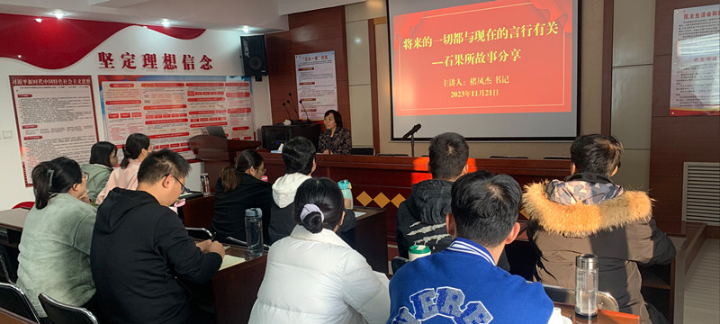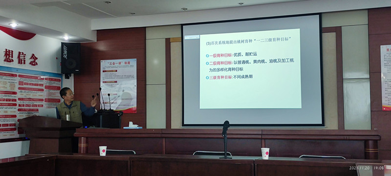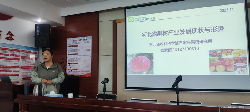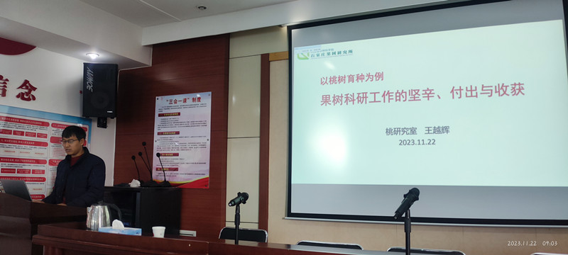 马之胜研究员介绍了科研及农业科研的特点,强调了科研人员应掌握的一些基本功及常用的科研思维方法;徐国良研究员分享了从事科技服务的一些经历和心得体会,表示下基层得做到脚勤、嘴勤、眼勤、手勤;褚凤杰书记结合石果所发展历程,讲述了马希满、刘承晏、肖海峰、周志芳等研究所老一辈科学家的故事经历,令人动容;鄢新民副所长从精准定位、确立目标、调查研究、分析总结等方面进行了职业规划和职业操守指导,给出了一些意见和建议;王越辉研究员详细讲解了桃育种的整体流程,指出育种目标来源于产业需求,进行产业调研十分必要;杨素苗副研究员对河北省果树产业发展现状与形势进行了介绍,并分享了一些工作和生活中的感悟体会。