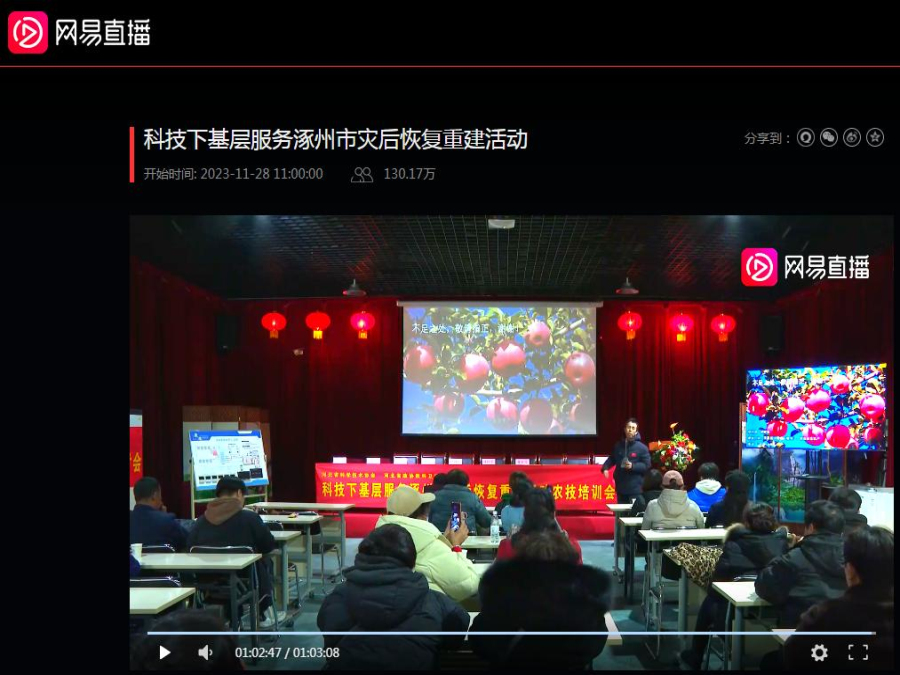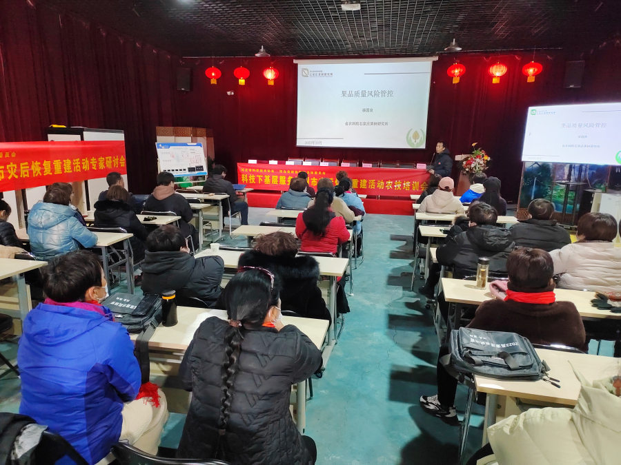 我所徐国良研究员作为受邀专家,深入涿州市百尺竿乡河北庚鸿农业科技有限公司科普基地,通过现场考察、与主要技术人员交流,了解了灾后该公司果树园区出现的诸多生产问题,提出了清园、消毒、涂白、晚剪等6条针对性强、切实可行的灾后越冬及开春管理建议。而后在河北庚鸿农业科技有限公司培训室,进行了线下、线上同步“影响果品质量的主要风险要素及其控制措施”农技培训,线下基地技术人员、百尺竿镇基层科技人员和周边乡镇果树种植大户30余人接受培训,线上点击浏览量超过130万人次。