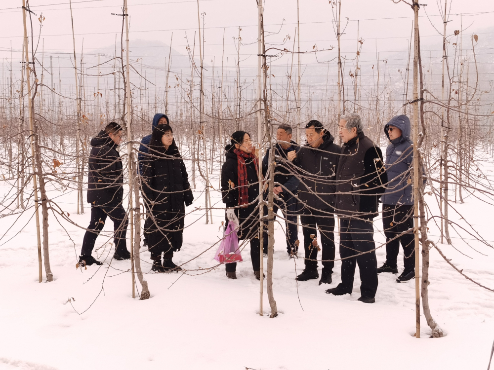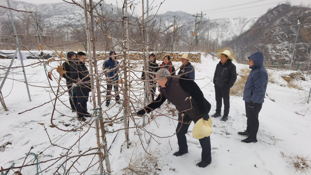 2月29日,苹果栽培团队专家冒着漫天飞雪深入园区,查看园区和树体生长情况。针对2023年冬季持续降雪、低温天气,在前期对园区应急技术指导基础上,调研果园幼树越冬情况,全面考察了园区各品种树体生长情况,制定不同年龄阶段树体整形目标,现场示范了春季轻简化整形修剪技术。