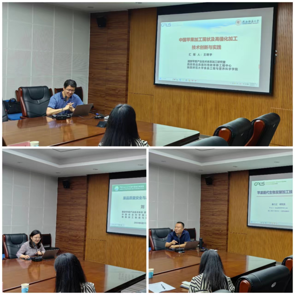 考察结束后,国家苹果体系加工研究室3位岗位专家受邀分别以“中国苹果加工现状及高值化加工技术创新与实践”、“苹果现代生物发酵加工技术创新与应用”和“果品质量安全与品质评价研究进展”为题做了学术报告,并与参会科技人员进行积极地互动交流。