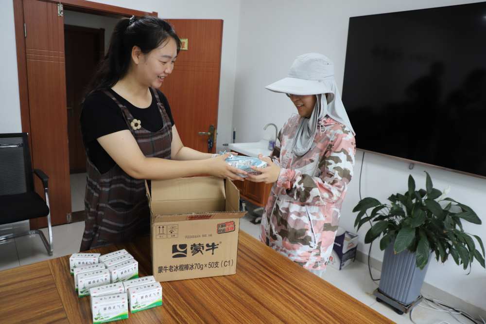 您所在的位置:首页 > 综合动态 连日来,石家庄气温居高不下,酷暑难耐,为不误农时、确保研究所后勤保障正常运转,各研究室、后勤科、试验管理站的户外工作不能间断,工作人员时常在烈日下挥汗如雨。为做好防暑降温、安全生产工作,研究所党总支、所工会于2024年7月24日上午,组织开展“送清凉”活动。鄢新民副所长带队,办公室、人事科(党办室)、工会等一同到生产一线进行慰问,为职工发放冰糕、藿香正气水等防暑降温慰问品,在炎炎夏日,为职工送去丝丝清凉;同时叮嘱他们注意关注身体健康,确保人身安全。