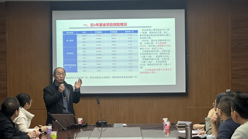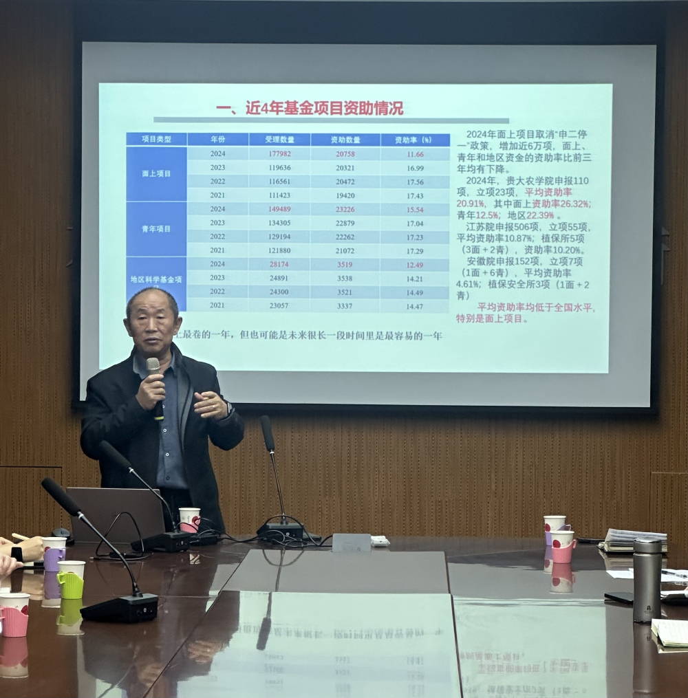 会上,刘凤权研究员从近4年国家自然科学基金项目的资助情况入手,围绕基金项目申报、评审和立项流程、基金项目申请书的撰写要求、申请书内容撰写要点及2025年申报建议等方面,分享了国家基金项目的申报经验,详细剖析了申报过程中的注意事项。