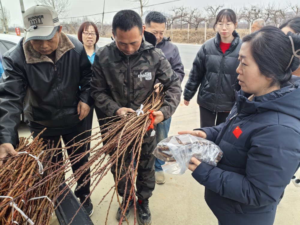 近日,李杏研究室主任武晓红率团队成员赴保定顺平县开展了春季杏树技术指导工作。顺平县农业农村局正高级农艺师张宪成、张丽丽以及相关技术人员陪同。这次技术服务不仅为当地农民提供了科学的栽培管理技术,还带来了我团队自主选育的杏新品种的接穗,同时还安排了新优系20-21E区域试验,为顺平杏产业发展注入科技力量。