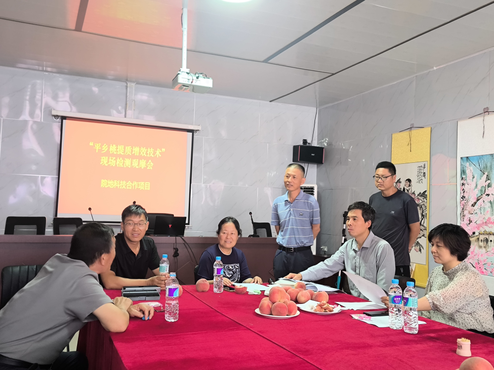 2025年7月18日,我所就承担的院地科技合作项目“平乡桃提质增效技术”,在邢台市平乡桃基地召开现场检测观摩会,会议邀请了省农业农村厅特色产业技术指导总站刘敏彦研究员、河北科技师范学院武军凯教授、邢台市农业科学研究院李林英研究员作为专家进行现场检测,平乡县董辉副县长、农业农村局郑晓娜局长及石家庄果树研究所、平乡桃基地有关人员出席参加。